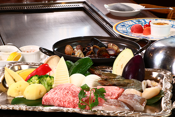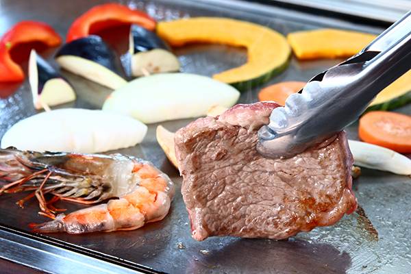 レストラン屋内の鉄板付テーブルを使用した鉄板グリルプランです。