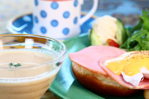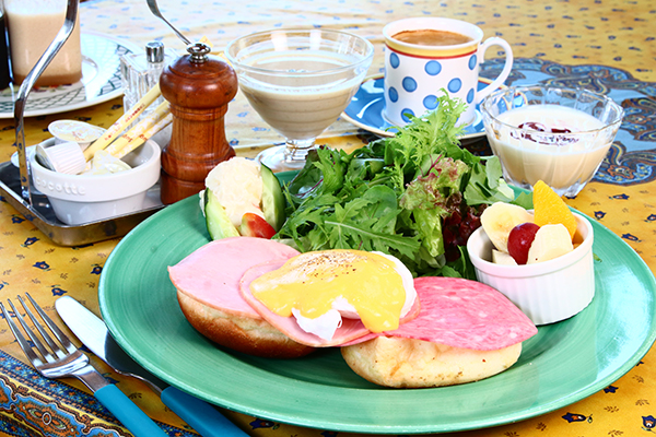 色鮮やかな洋朝食。河口湖KOPANさんのバンズを使用した特製エッグベネディクト。浜名湖畔の水面にキラキラと輝く朝日を眺めながら、優雅なひとときをお楽しみください。